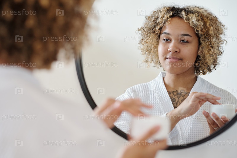 Молодая красивая женщина смотрит в зеркало, когда собирается наносить крем на лицо