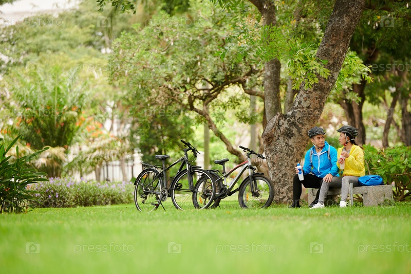 Пара пьет воду под деревом в парке