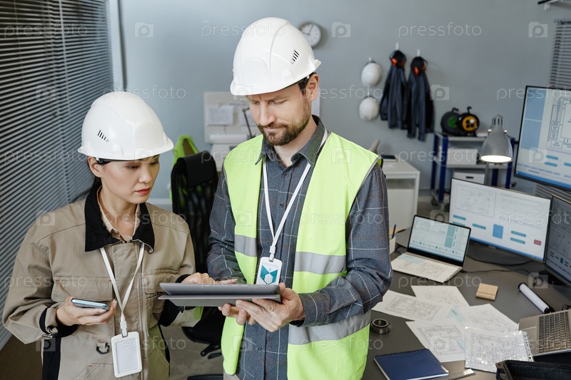 Два инженера, одетые в жесткие шляпы внутри и просматривающие чертежи