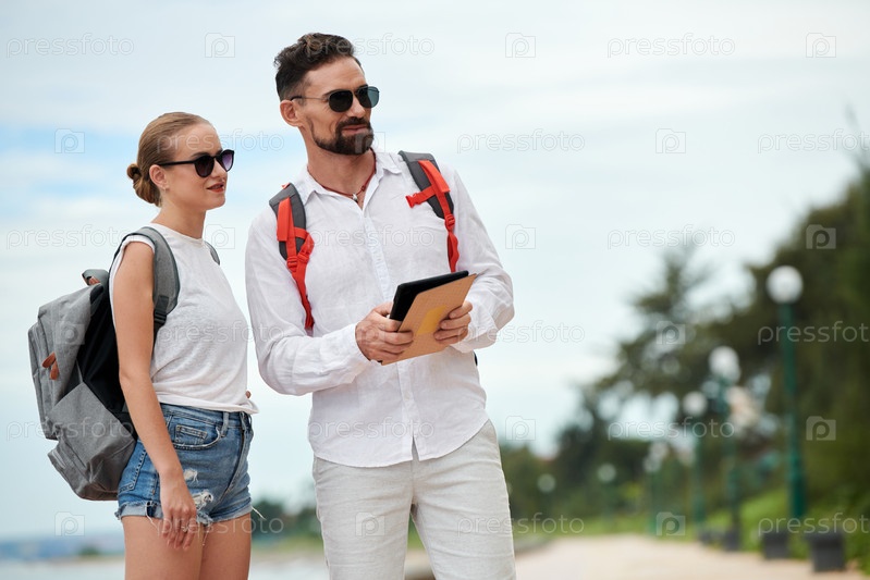 Пара туристов, использующих планшетный компьютер на открытом воздухе
