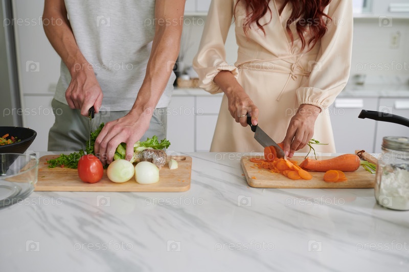 Вырезанный снимок молодой гетеросексуальной пары, режущей свежие овощи с помощью ножей