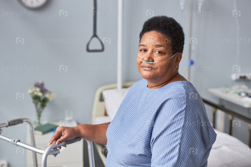 Пожилая женщина смотрит на камеру в больничной комнате с кислородной поддержкой