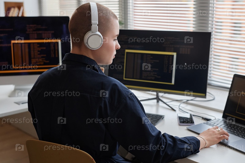 лысая молодая женщина, носящая наушники и использующая компьютер