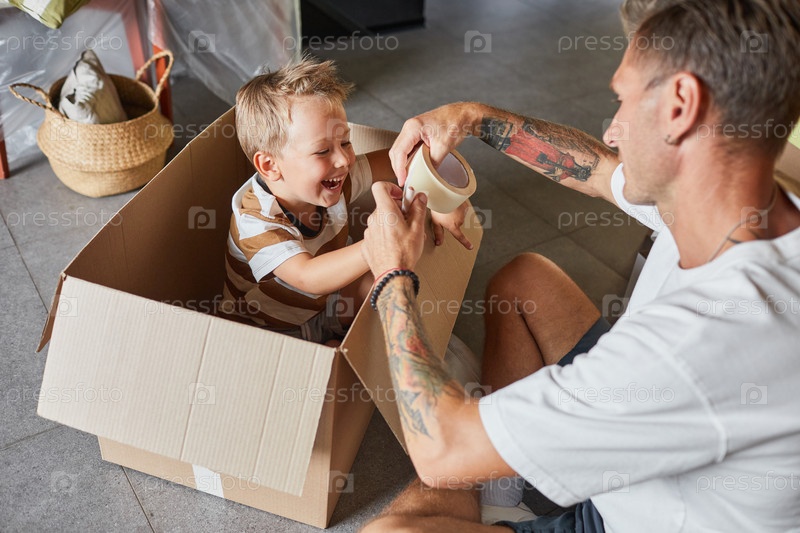 Маленький мальчик играет в коробке