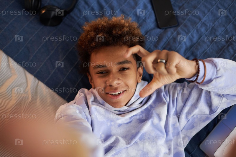 Сосредоточьтесь на лице веселого подростка, который смотрит в камеру, делая селфи