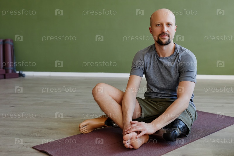 Мужчина с протезированной ногой сидит на коврике для йоги в помещении