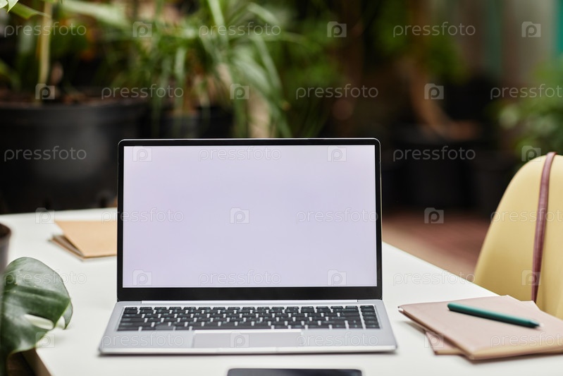 Ноутбук с пустым экраном стоит на столе среди канцелярских принадлежностей