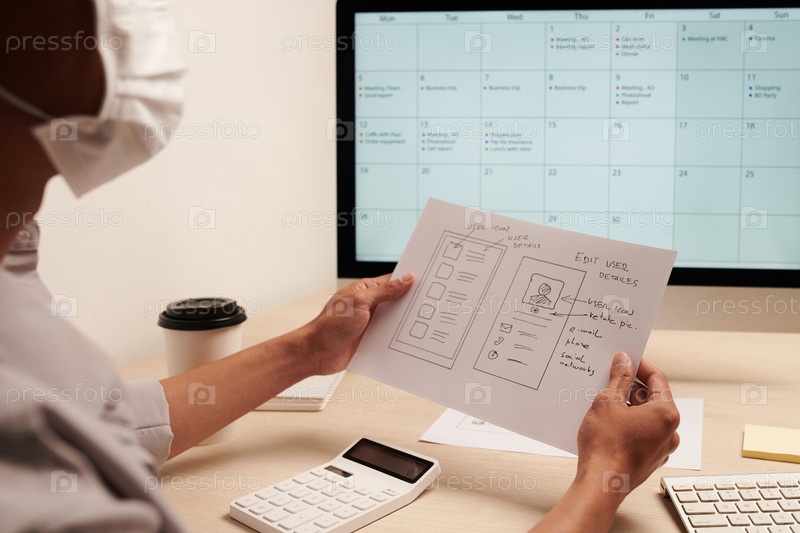 Дизайнер, держащий в руках нарисованный макет UI