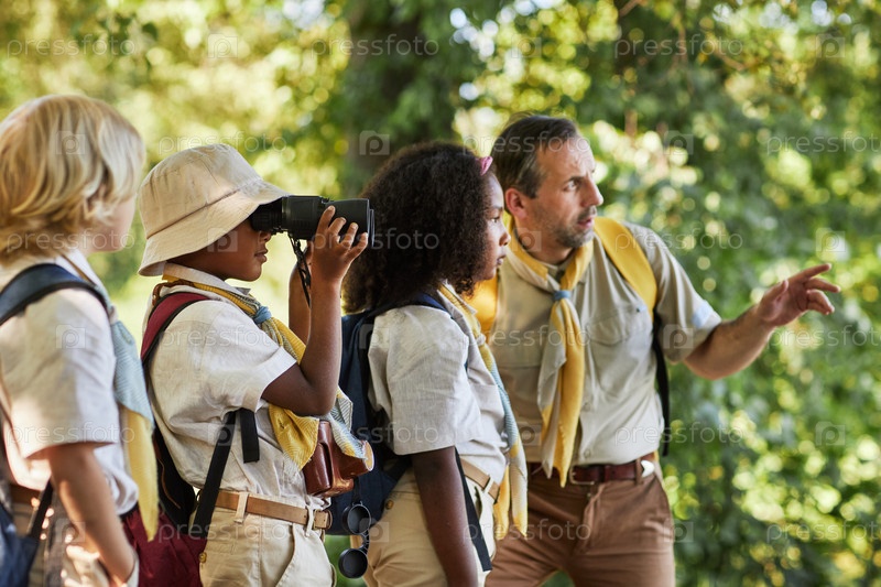 Боковой вид на разнообразную группу скаутов в лесу, смотрящих в бинокль