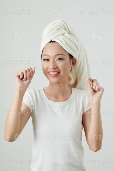Женщина, использующая зубную нить