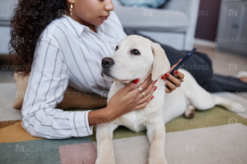 Молодая чернокожая женщина обнимается с собакой, лежащей на полу и использующей смартфон