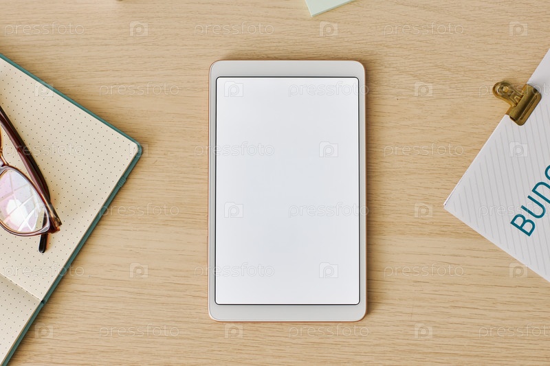 Минимальный верхний вид цифрового планшета с макетом белого экрана на столе из легкого дерева