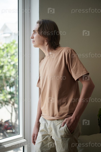 Человек смотрит наружу через окно