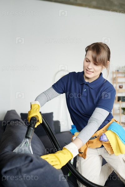 Молодой работник выполняет работу по дому с помощью пылесоса