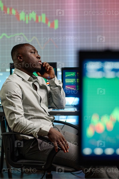 Черный брокерский работник разговаривает по телефону