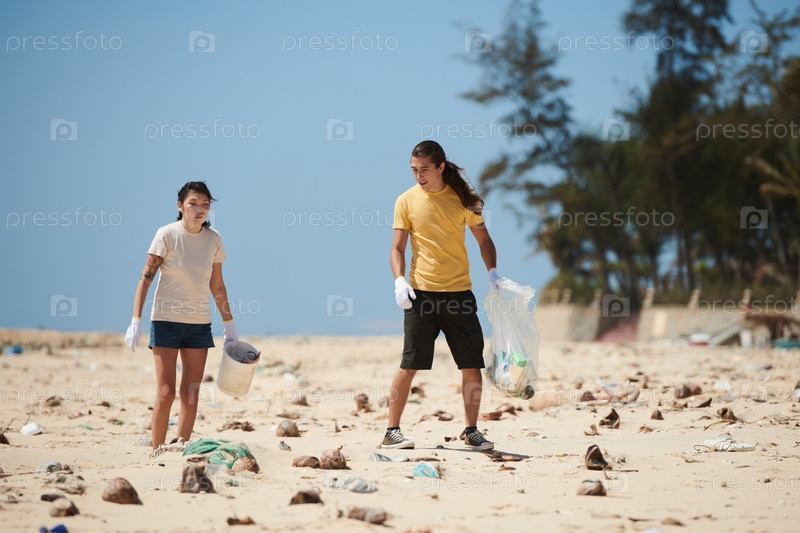Молодая пара убирает пляж