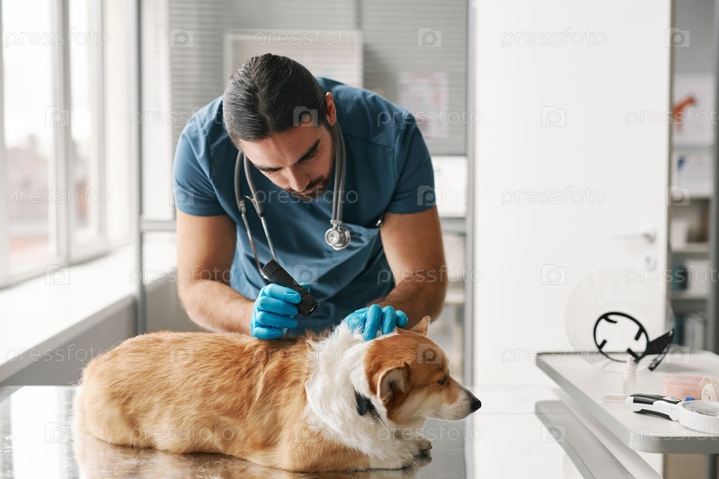 Молодой ветеринар с маленьким фонариком осматривает кожу больной собаки-корги