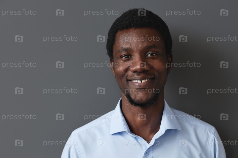 Молодой чернокожий бизнесмен улыбается камере на стене