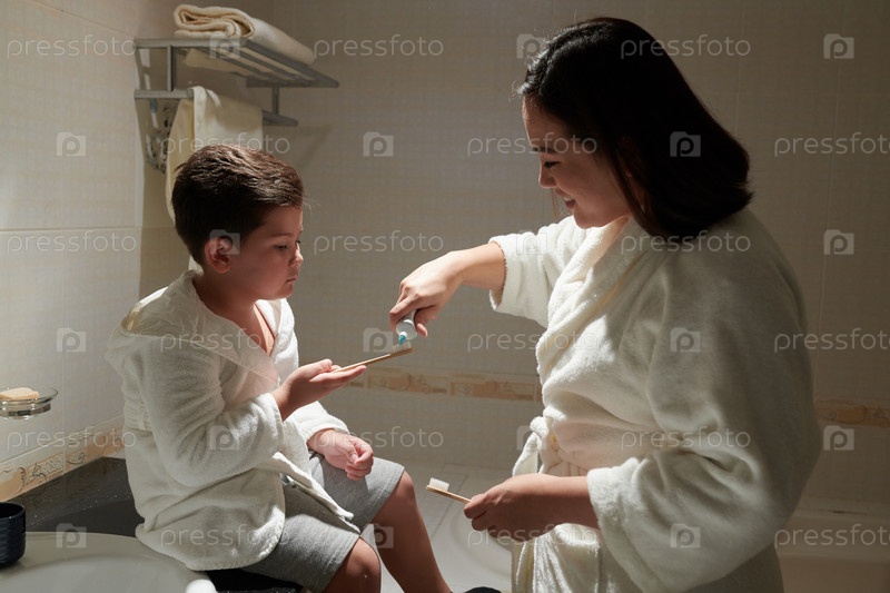 Мать и сын чистят зубы