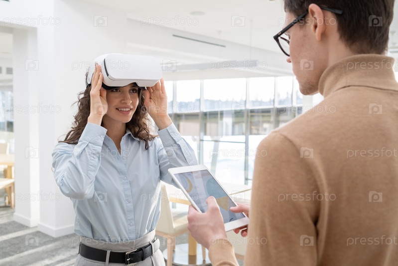 Счастливый молодой сотрудник касается VR-гарнитуры, общаясь с коллегой