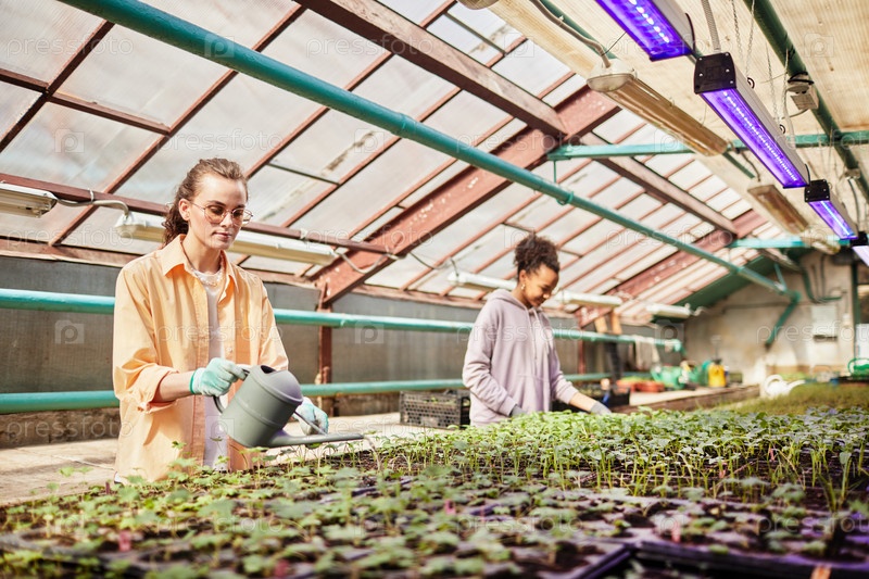 Две межкультурные садовольницы заботятся о зеленых саженцах