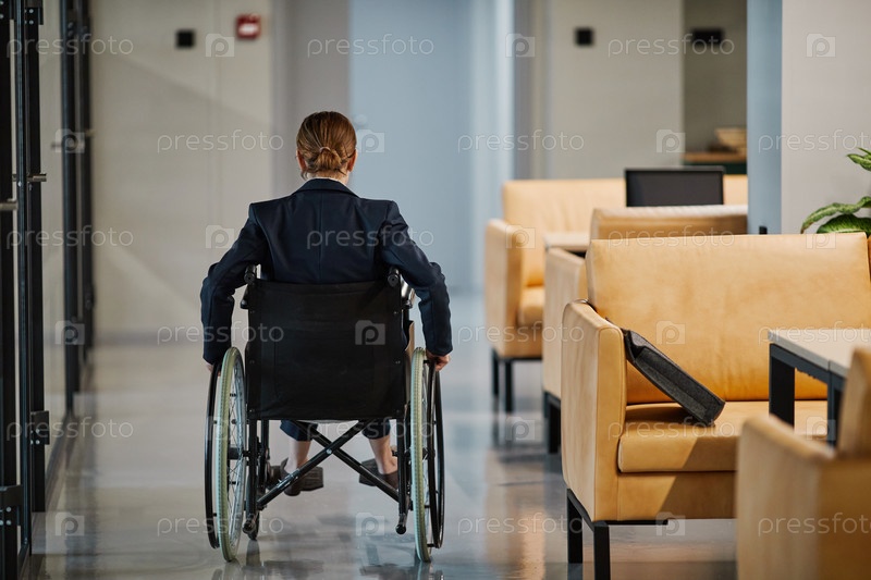 Пользователь инвалидной коляски в офисе Задним видом