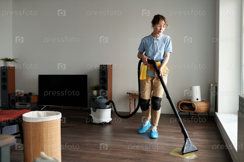 Профессиональная уборщица пылесосит квартиру