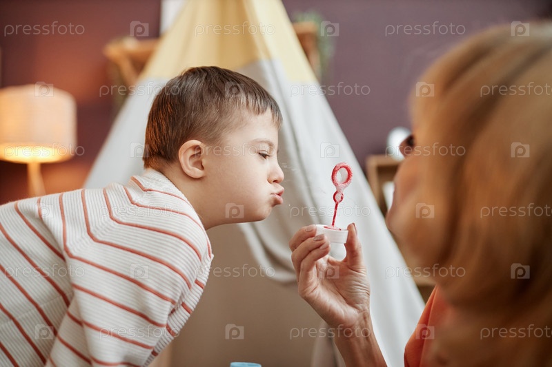 Маленький мальчик с синдромом Дауна дует пузыри, играя со своей матерью в помещении