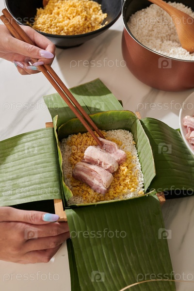 Добавление свинины в квадратный торт женщина