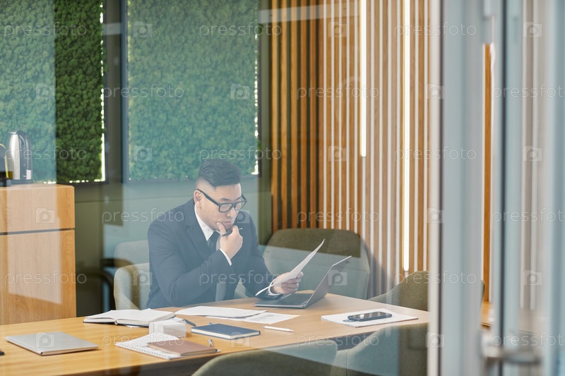 Успешный азиатский бизнесмен в стеклянном офисе