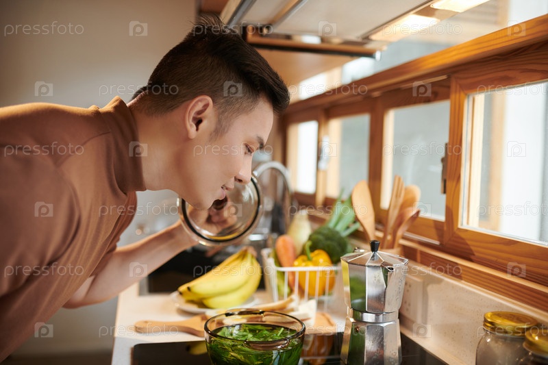 Человек, нюхающий суп из печи