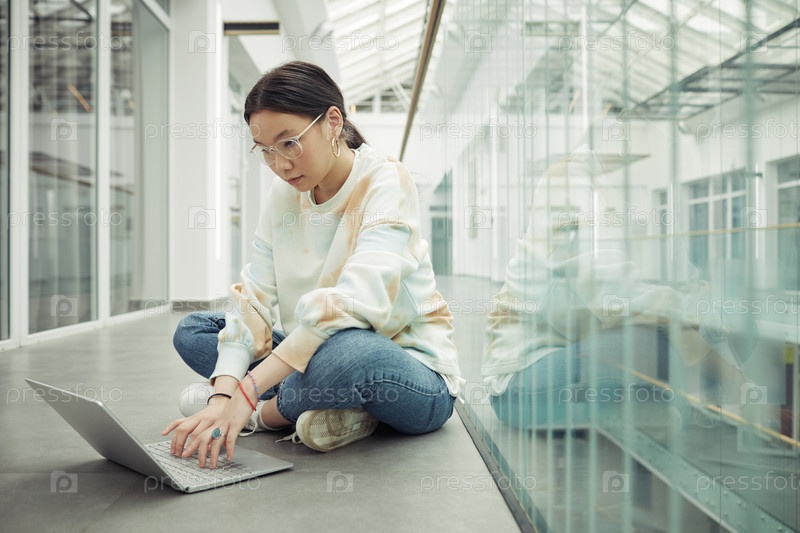Девушка-подросток в синих джинсах, белой майке и резиновых ботинках прикасается к клавишам ноутбука