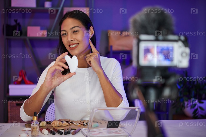 Улыбающаяся женщина снимает массажное видео