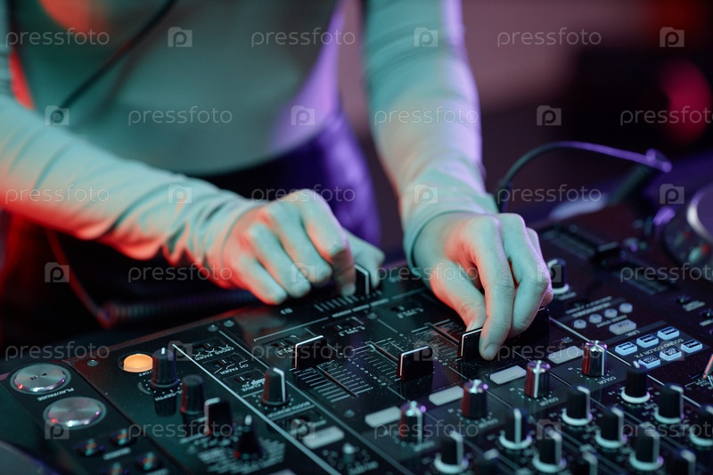 Молодая женщина как диджей, делающий музыкальные треки за микшерным столом