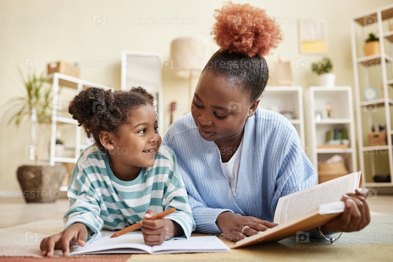 Милая чернокожая девушка и мать лежат на полу дома