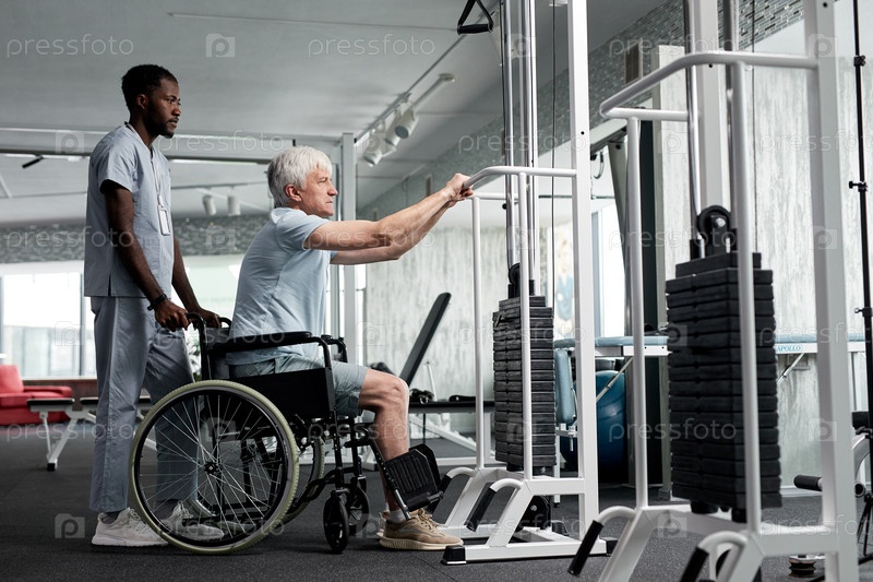 Человек в инвалидном кресле делает реабилитационные упражнения
