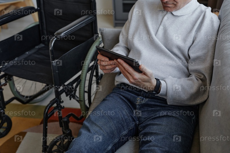 Непризнанный пожилой мужчина с инвалидностью отдыхает дома и пользуется планшетом