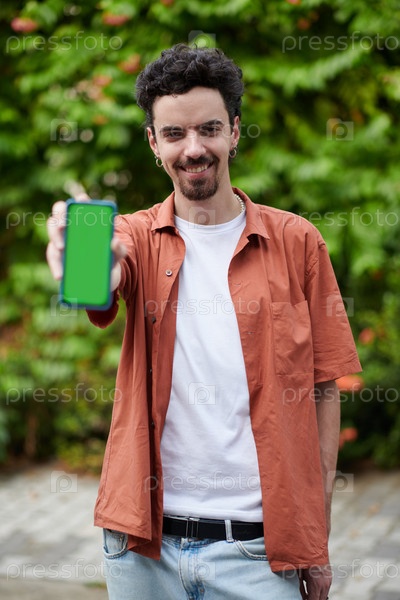 Счастливый мужчина показывает смартфон Joyful