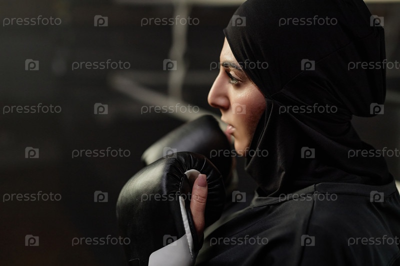 Близкий план молодой спортсменки в черном хиджабе и боксерских перчатках