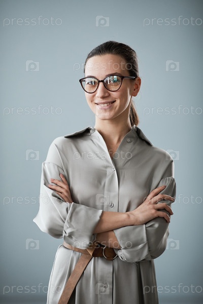 Молодая элегантная деловая женщина или учительница в очках и умной повседневной одежде