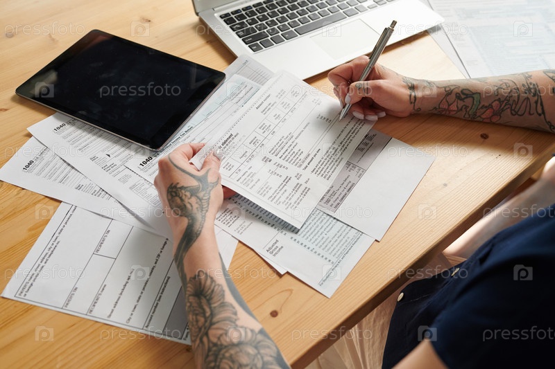 Женщина заполняет счета и банковские выписки