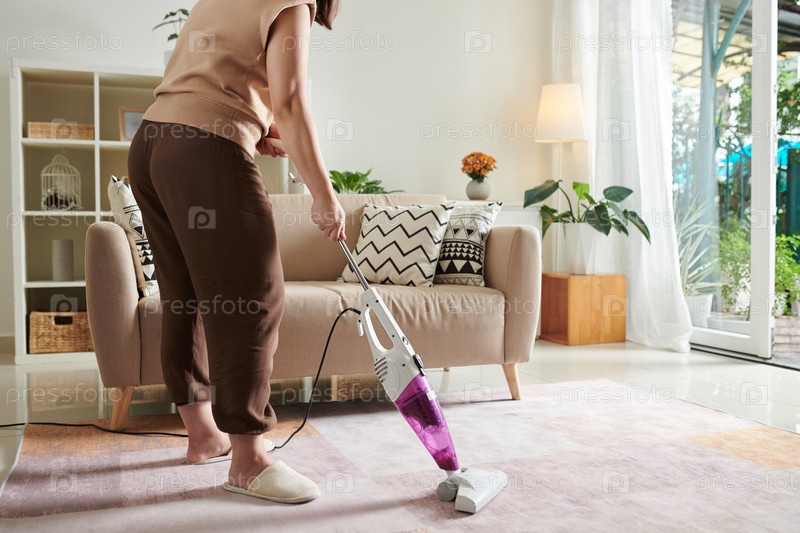 Женщина, использующая пылесос для уборки комнаты