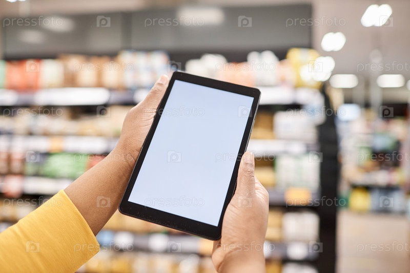 Таблет с пустым макетом белого экрана в супермаркете