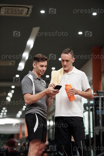 Спортсмен показывает фитнес-приложение тренеру
