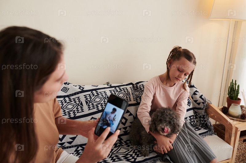 Женщина фотографирует дочь с собакой