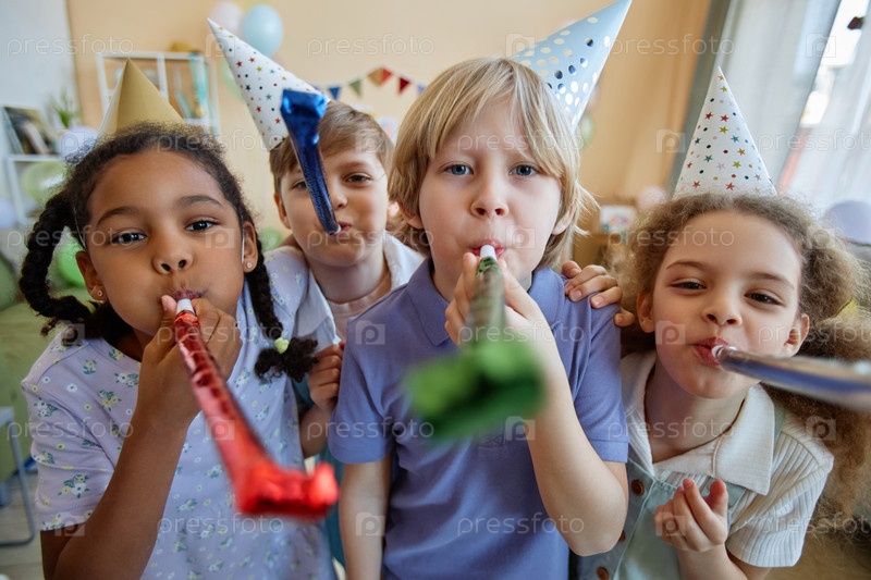 Трое детей держат в руках парти-духи и веселятся