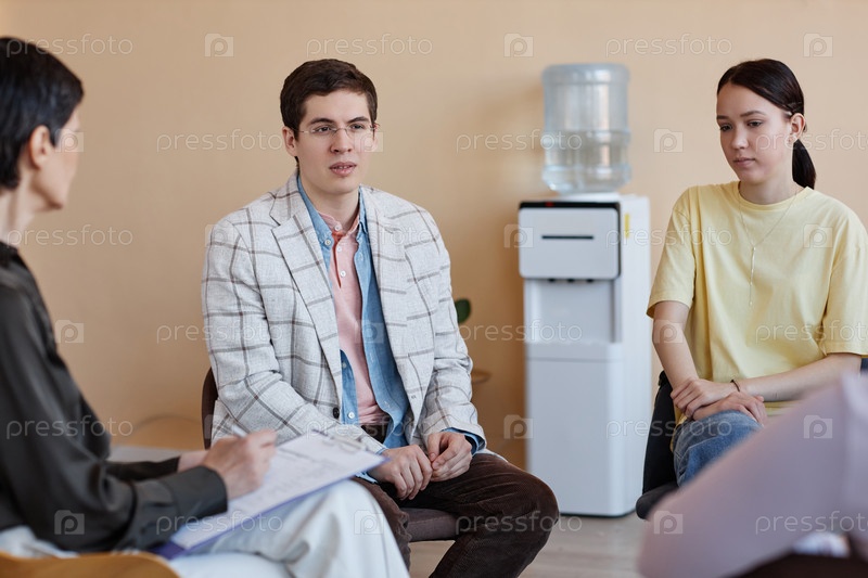 Молодые люди разговаривают с психологом на сеансе
