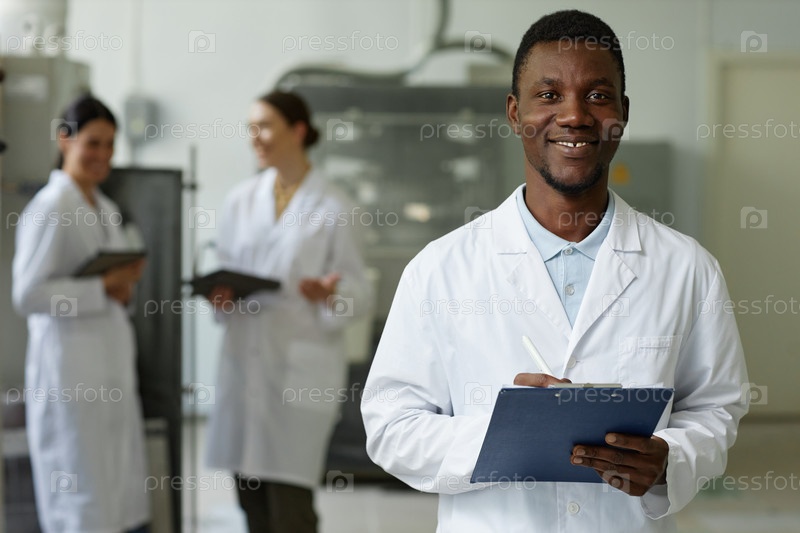 Улыбающийся чернокожий мужчина в лабораторном пальто смотрит на камеру в фабричной мастерской