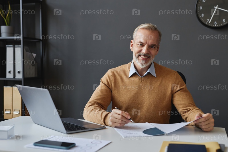 Зрелый бизнесмен на рабочем месте в офисе у камеры