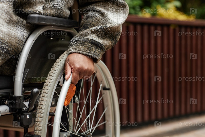 Рука на инвалидном кресле колесо Closeup